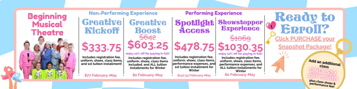 The total cost for Winter Trimester (September-January) is $637.40 (with 10% discount) for Musical Theatre. Tuition will be prorated by start month. The difference between your installments and the total is what is due up front. See below for your balance due to start.