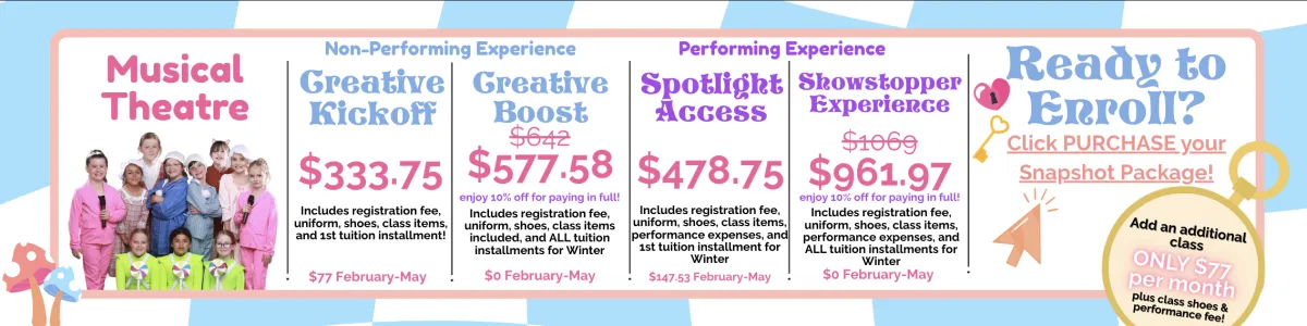Our Snapshot pricing is designed to be simple and predictable. You pay once, and then you don’t have to worry about surprise fees throughout the trimester. All required class and performance items are included upfront so your performer can fully participate without interruption.