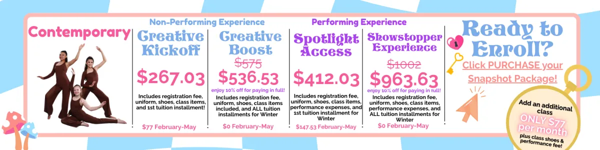 The total cost for Winter Trimester (September-January) is $601.85 (with 10% discount) for Contemporary. Tuition will be prorated by start month. The difference between your installments and the total is what is due up front. See below for your balance due to start.
