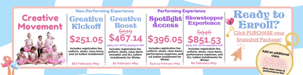 The total cost for the Spring Trimester (February–May) for Beginning Creative Movement is $912.65 with the 10% Snapshot discount. Tuition will be prorated based on your start month. The difference between your installment payments and the total cost is what is due at enrollment. Please see below for your balance due to start.