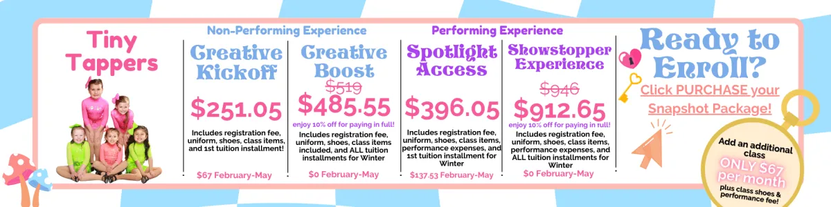 The total cost for Winter Trimester (September-January) is $557.57 (with 10% discount) for Tiny Tappers. Tuition will be prorated by start month. The difference between your installments and the total is what is due up front. See below for your balance due to start.