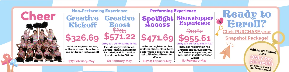 The total cost for the Spring Trimester (February–May) for Beginning Cheer is $1023.29 with the 10% Snapshot discount. Tuition will be prorated based on your start month. The difference between your installment payments and the total cost is what is due at enrollment. Please see below for your balance due to start.