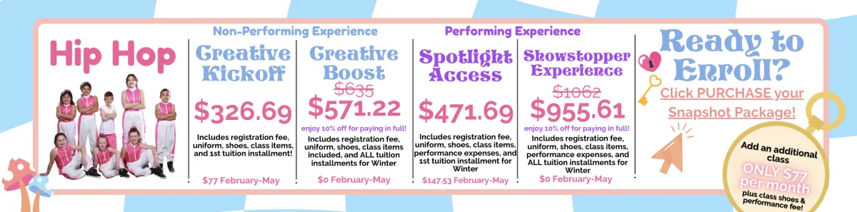 The total cost for the Spring Trimester (February–May) for Beginning Hip Hop is $1023.29 with the 10% Snapshot discount. Tuition will be prorated based on your start month. The difference between your installment payments and the total cost is what is due at enrollment. Please see below for your balance due to start.
